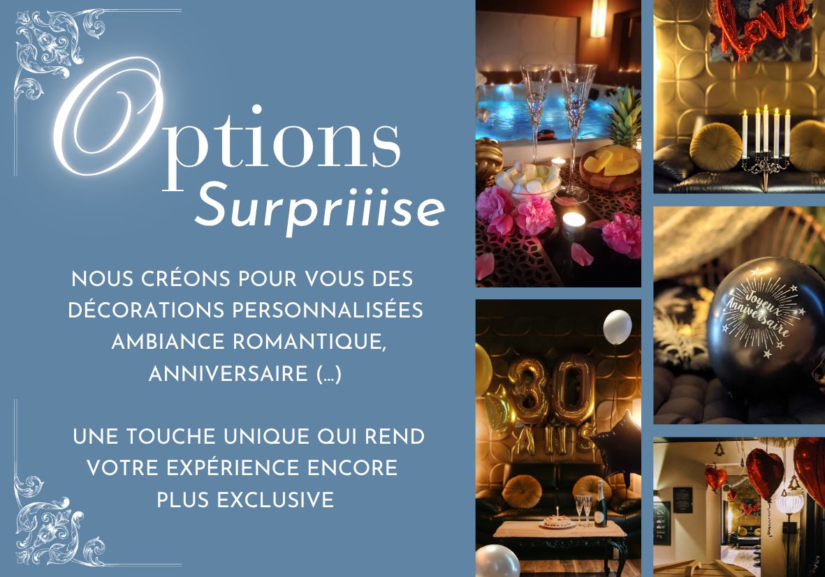 Nous créons pour vous des décorations personnalisées, ambiance romantique, anniversaire (...). Une touche unique qui rend votre expérience encore plus exclusive. Tarif selon vos envies et votre budget. Demande à formuler via le formulaire de contact
